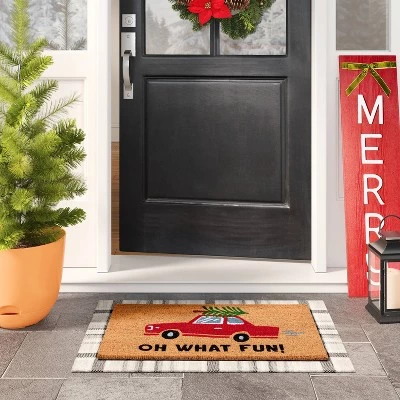 Celebrate the season with an inviting welcome for your friends and family during the holidays with this Oh What Fun Car Doormat from Wondershop™. This indoor/outdoor welcome mat features a 100% coir construction in a natural beige finish, printed with a red car carrying a green Christmas tree on top. Black block letters underneath the design spell out “Oh what fun” to add to the cheer. The medium-pile coir construction also features a 100% vinyl backing. Simply place this holiday welcome mat on your porch or just inside your door for guests to wipe off their boots and stay a while.