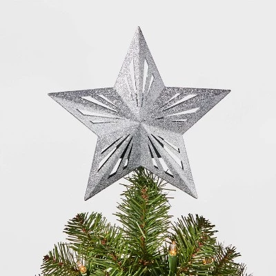 illuminate your Christmas scene with this Silver 3-LED Light Star Tree Topper from Wondershop™. This light-up tree topper with three LED lights adds fun and excitement to your seasonal holiday decorations. It features a rotating light that projects pattern on the ceiling. A five-point star design for a beautiful, classic look, and the glittery silver finish adds a touch of sparkle and shine, while the cut-out details let the light pass through. The easy-clip design is simple to quickly and securely fasten to the top of your tree. Add this festive tree topper to your holiday tree in your entryway or living room to bring some Christmas cheer.