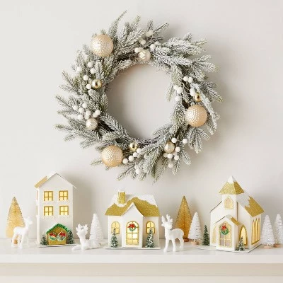 Bring the magic and nostalgia of an old-fashioned holiday to your mantel, entryway or other indoor decorative tableaux with this White and Gold 12pc Battery Operated Decorative Village Kit from Wondershop™. The set includes three white and gold polyresin houses, three polyresin deer in white, as well as six bottle brush white and gold trees with glitter. The houses illuminates thanks to the two required LR44 alkaline batteries that are included.