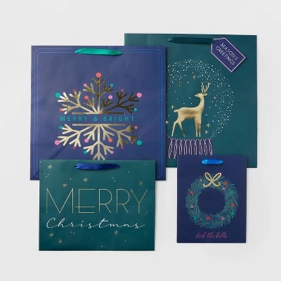 Present your festive gifts in even a more special way with the help of this 4-Count of Assorted Gift Bags from Wondershop™. This set includes four paper gift bags in different sizes with each featuring a different festive print and message — from a reindeer snowglobe and a colorful snowflake print to “Merry Christmas” greeting and a wreath print with “Deck the Halls” message — in shades of green and blue, making them just the right pick for Christmas gifting. Best of all, these decorative gift bags feature ribbon handles for easy and secure carrying. Simply fill them with colorful tissue paper and pompoms to delight the recipient.