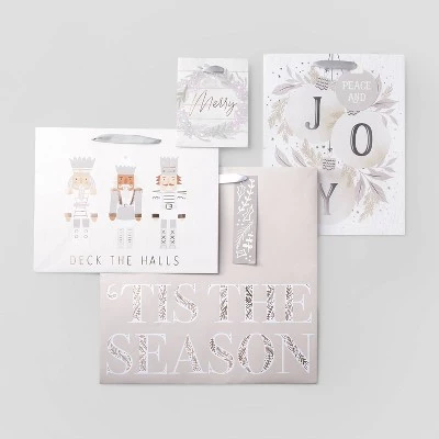 Add festive joy and elegance to your gifts with the 4-Count of Assorted Gift Bags from Wondershop™. Each piece in this assorted gift bag pack comes in a different size and a different print in silver colors to give you plenty of options for your gifting needs. The print varies from the phrases “Merry” to “Joy” and more for festive appeal. These gift bags are perfect for the holiday season, and they’re easy to carry with the built-in ribbon handles.