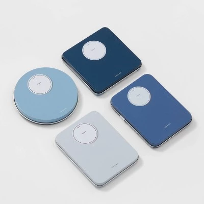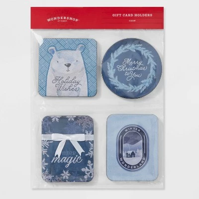 Create a sweet impression by presenting gift cards in this 4-Count of Gift Card Holders from Wondershop™. This festive gift card holder set includes three rectangular and one round tin gift card holder, each featuring a different holiday print, text or accent in shades of blue to add sweet style to your gift giving. Best of all, each gift card holder features a name tag on the back to let you add your and the recipient’s name to it.