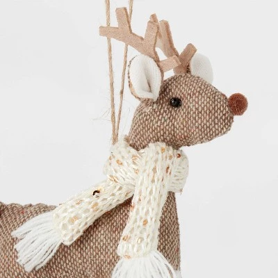 Lend a cute finish to your holiday decor with this 4-Count Fabric Deer Christmas Tree Ornament from Wondershop™. This Christmas tree ornament set includes four fabric ornaments designed as small deer with pompom nose in cream and brown hues wearing chunky cream and brown scarves to let you pair them with different animal-themed ornaments, lights and garlands to create a stunning festive display. Best of all, each ornament included in the pack features an attached loop for easy hanging from your Christmas tree.