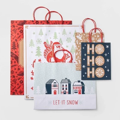 Hand out festive gifts in cute style with the help of this 5-Count of Assorted Gift Bag Set from Wondershop™. This set includes five paper gift bags in different sizes, with each featuring a different festive print — from the messages “Ho Ho Ho” and “Happy Holidays” to reindeer, village house and Santa prints — making them just the right pick for Christmas gifting. Plus, these decorative gift bags feature tote handles for easy and secure carrying. Simply fill them with colorful tissue paper and pompoms to delight the recipient.