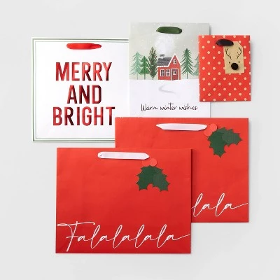Lend festive joy to your gifts with these 5-Count Perfect Christmas Assorted Gift Bags from Wondershop™. Each piece in this assorted gift bag pack comes in a different size and a different print to give you plenty of options for your gifting needs. The print varies from the text “Fa La La” or “Merry and Bright” to a winter scene, making the bags perfect for the holiday season — and best of all, they’re easy to carry with the built-in ribbon handles.