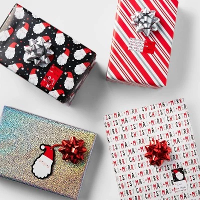 Make sure your holiday gifts look bright and attractive by wrapping them with the 80-Square-Foot Gift Wrap Pack from Wondershop™. This gift wrapping set includes gift wrap, tags, adhesive tags and bows, all designed in red, white and silver hues for a festive look. The gift wrap comes in printed patterns that range from Santa faces to the text “Merry Christmas” and more to give you a variety of festive gift-wrapping options, and you can then decorate with the tags and/or bows for a personalized touch.