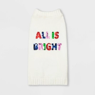 When the cold winter weather sets in, keep your furry best friend warm and cozy in this All is Bright Dog and Cat Sequin Sweater from Wondershop™. Made from soft acrylic for all-day comfort, this dog and cat sweater is designed in a cream hue with the colorful sequined text “All is Bright” for classic holiday style. Best of all, the pullover design makes it easier to dress fussy pets!