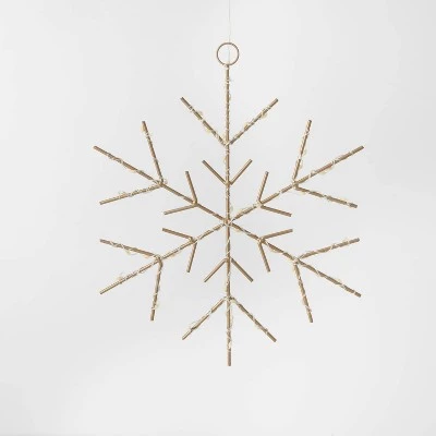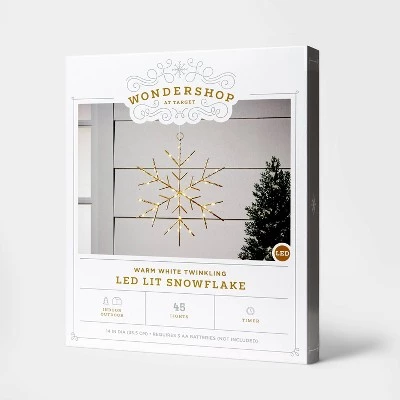 Bring a little extra light and cheer to your front door, window, living room and more with the Christmas LED 14 inch Gold Snowflake Novelty Sculpture from Wondershop™. This snowflake-shaped light-up holiday decor features 45 warm white lights for a welcoming and festive glow you’ll love, in a combination of 9 twinkling and 36 steady illuminating long-lasting LED bulbs. A timer feature lets you set this light-up snowflake decor to stay on for 6 hours and off for 18 if you prefer, and a top loop makes for easy hanging in the location of your choice.