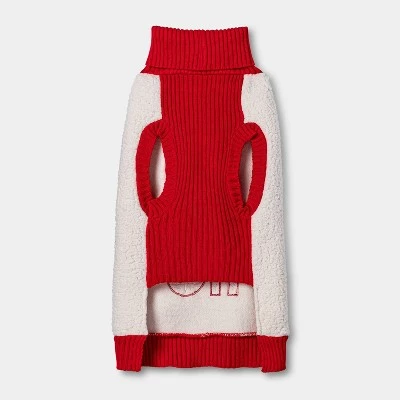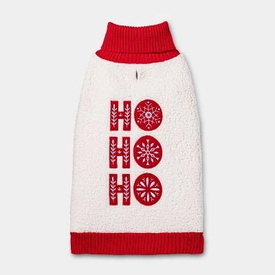 Your pet can eagerly await the coming of Santa Claus along with you wearing this Ho Ho Ho Dog and Cat Sweater from Wondershop™. Made from soft acrylic to help keep them warm on chilly winter days, this dog and cat sweater is designed in red and cream hues with the text “Ho Ho Ho” on the back for classic Christmas flair. Best of all, the pullover style makes it easier to dress fussy pets.