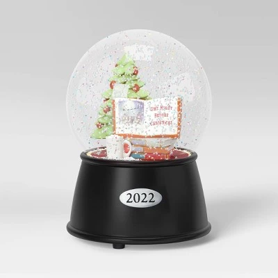 Spread Christmas cheer around your house with this Holiday Book Snow Globe from Wondershop™. This decorative snow globe has a clear, glass-like dome that is affixed to a raised pedestal base engraved with the year 2022. It has a vibrant holiday tree in green and red colors, a mug and an open holiday book that’s kept on a stack of books featuring the text “The Night Before Christmas” on one page and thematic imagery on the other. A great accent piece for your entryway console, mantel or coffee table, this classic decor fills with faux snow and colorful confetti when shaken for a magical effect.