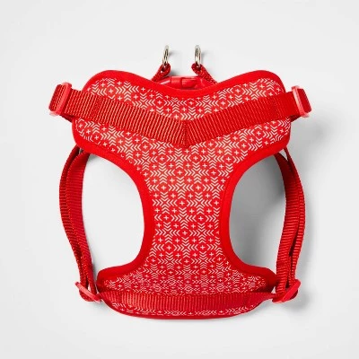 Brighten up your cute canine’s look for the festive season with this Holiday Dog Harness from Wondershop™. This red harness is decorated with a seamless white-lined geometric print and accented with solid red piping trim. It’s made of a soft fabric with mesh lining to keep your pooch comfortable while offering you stress-free control. It also features an adjustable clip-in clasp closure to help it stay securely on their body during daily walks or training sessions, along with metal D-rings at the top that make it easy to attach a variety of leashes.