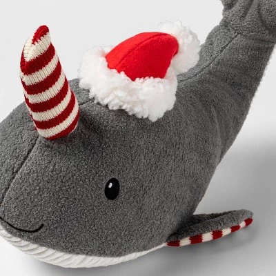 Ideal for snuggling or engaging in a game of fetch, the Narwhal Dog Toy from Wondershop will make a great addition to your pets toy collection. Designed in the shape of a whale , this whimsical guy pulls out all the stops just in time for the holidays. This toy showcases a soft gray plush, corduroy belly, embroidered eyes, candy cane stripes and a Santa hat to boot. With the addition of a squeaker and crinkle, this toy is sure to bring a boost to your pets holiday and beyond.