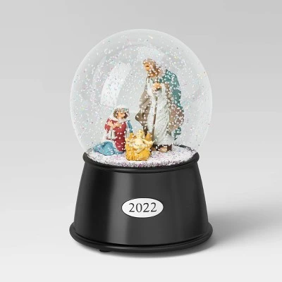 Add elegant style to your traditional Christmas decor with this Nativity Snow Globe from Wondershop™. This decorative snow globe showcases Jesus Christ’s birth scene with Mary and Joseph looking at baby Jesus, all enclosed in a clear glass dome attached to a weighted black base with “2022” embossed on the front. A sweet accent piece for your coffee table, console table, mantel or desk, this festive snowglobe fills with faux-snow and colorful confetti when shaken to create magical, wintry charm.