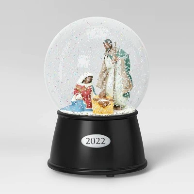 Accentuate your traditional Christmas decor with this Nativity Snow Globe from Wondershop™. This decorative snow globe showcases Jesus Christ’s birth scene with Mary and Joseph looking at baby Jesus, all enclosed in a clear glass dome attached to a weighted black base with “2022” embossed on the front. A sweet accent piece for your coffee table, console table, mantel or desk, this festive snowglobe fills with faux-snow and colorful confetti when shaken to create magical, wintry charm.