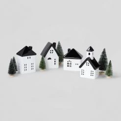 10pc Battery Operated Decorative Ceramic Village Kit White/Black with Green Trees – Wondershop™
